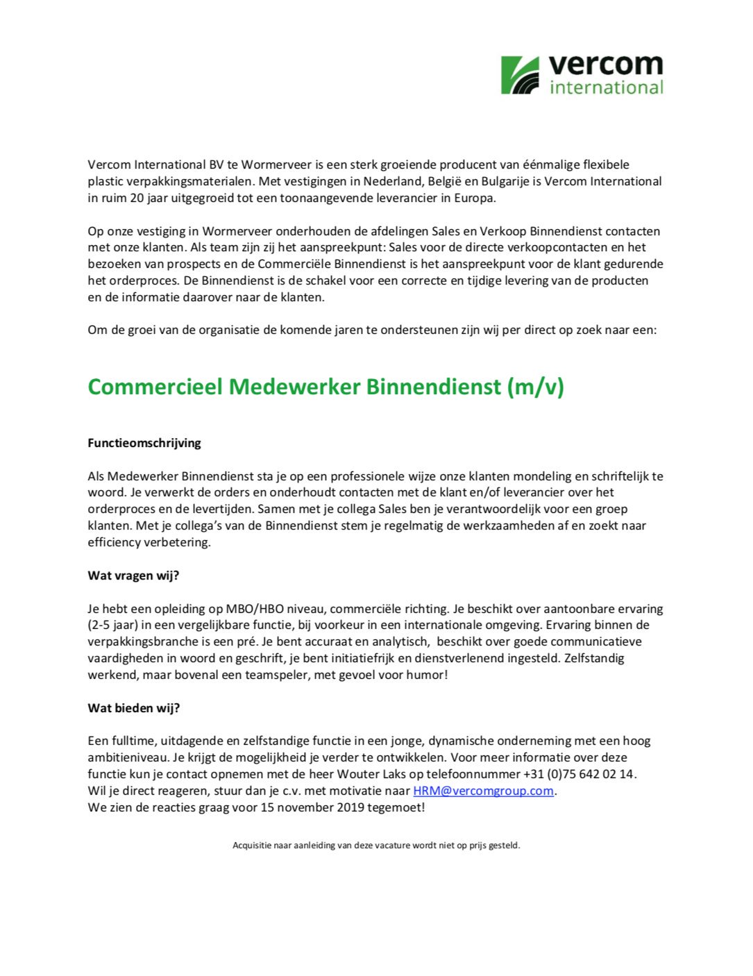 Nog meer tips op een rij. Sollicitatiebrief medewerker verkoop binnendienst sollicitatiebrief en cv. Hallo mede carrièretijgers ik probeer weer terug op de arbeidsmarkt te komen maar wat is het ongelofelijk moeilijk om alleen al uitgenodigd te worden voor een gesprek ik wil vandaag een brief de deur uit doen. Het salaris hangt sterk af van de genoten opleiding het type bedrijf en de sectordaarnaast is het mogelijk om bij een dienstverband van 40 uur 27 vakantiedagen te krijgen. Wat verdient een commercieel medewerker binnendienst. Heel benieuwd wat jullie hier van vinden en of jullie feedback willen geven.