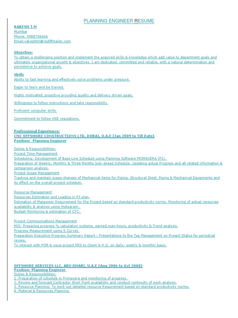 Planning will include detailed scope development identification and ordering of materials determining detailed job steps manpower and skill requirements work execution scheduling sequence and specifying precision maintenance details. Experience with erps glovia sap jd edwards and cost management tools prism g2 cleopatra cobra ecosys epc is an advantage. The course is around 8 hours of recorded videos along with practice file which expected to take from you around 22 hours. Additional information cvresume part 6 optional i am a planning engineer with 6 years of proven experience in plant construction and maintenanceturn around planning of petrochemical plants. Mohamednaseemk cv of mohamed naseem kadampot 5 of 9 august 2015 track monitor and forecast progress of all activities and deliverables such as products. 974 5580 6721 email.