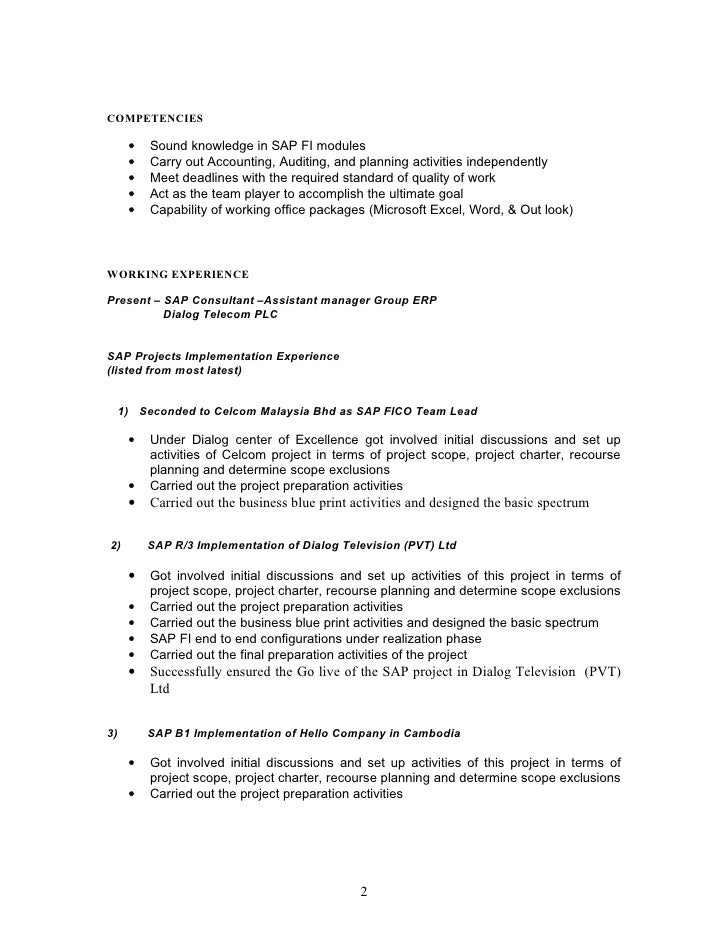 Sap fico resume with 3 years experience is the best and easy format for you and you can download free resumes regarding junior accountants senior accountants. 5 10 years experienced cv bba cv finance cv mba cv mba finance sap cv sap fico cv sample template example of professional curriculum vitae cv format with career objective for sap fi consultant with 5 years work experience in india in word doc pdf free download. Sap consultants analyze design and configure computer software and systems in accordance with a clients needs. Make sure to make education a priority on your sap consultant resume. If youve been working for a few years and have a few solid positions to show put your education after your sap fico consultant experience. Experience in leading technicalfunctional team for technical realization of bi solution.