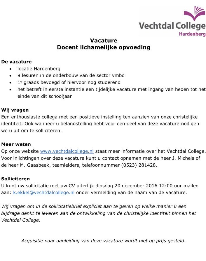 Vacature Docent Lichamelijke Opvoeding 2016 2017 16 0 28