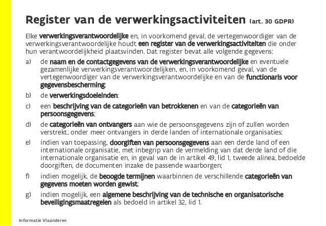 Het verwerkingsregister bevat informatie over de persoonsgegevens die worden verwerkt. Lees hier wat dat inhoudt welke vereisten er gelden en welke acties u moet ondernemen. Avg is het voor de meeste organisaties verplicht om een register van verwerkingsactiviteiten bij te houden. Dit register moet geactualiseerd zijn. Wel schrijft de algemene verordening gegevensbescherming avg voor welke informatie u als verantwoordelijke of verwerker in het verwerkingsregister moet zetten. Verwerking een risico inhoudt op de rechten en vrijheden van personen.
