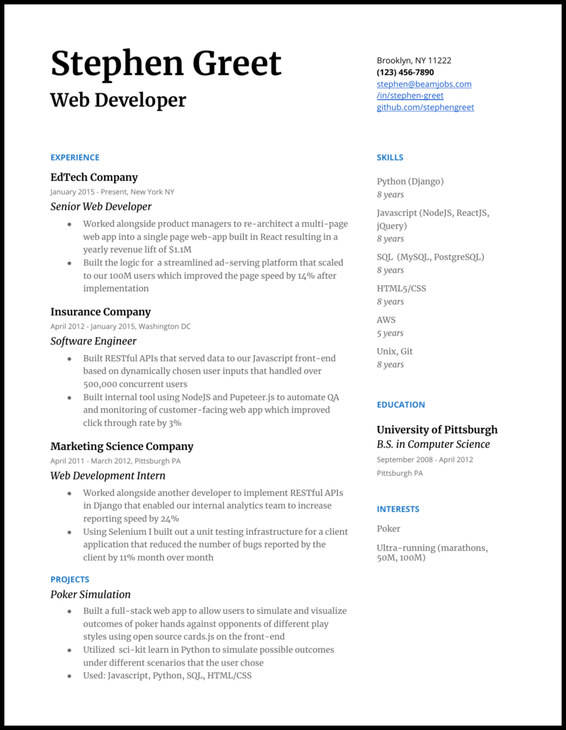 A regular example resume for this job mentions responsibilities such as creating webpage layouts writing code editing website content and making adjustments based on client feedback. Follow our expertly written tips and get in front of interviewers. A good web developer resume takes the time to outline the vast experience that a developer has in all of the disciplines that clients will need to maintain and enhance their web presence. Thus the format of a web developer resume can be more artistic than that which would be utilized for more conservative career fields. Delivered a presentation on cloud computing at the hackmty hackathon in. Web developer resume example a proven job specific resume sample for landing your next job in 2020.